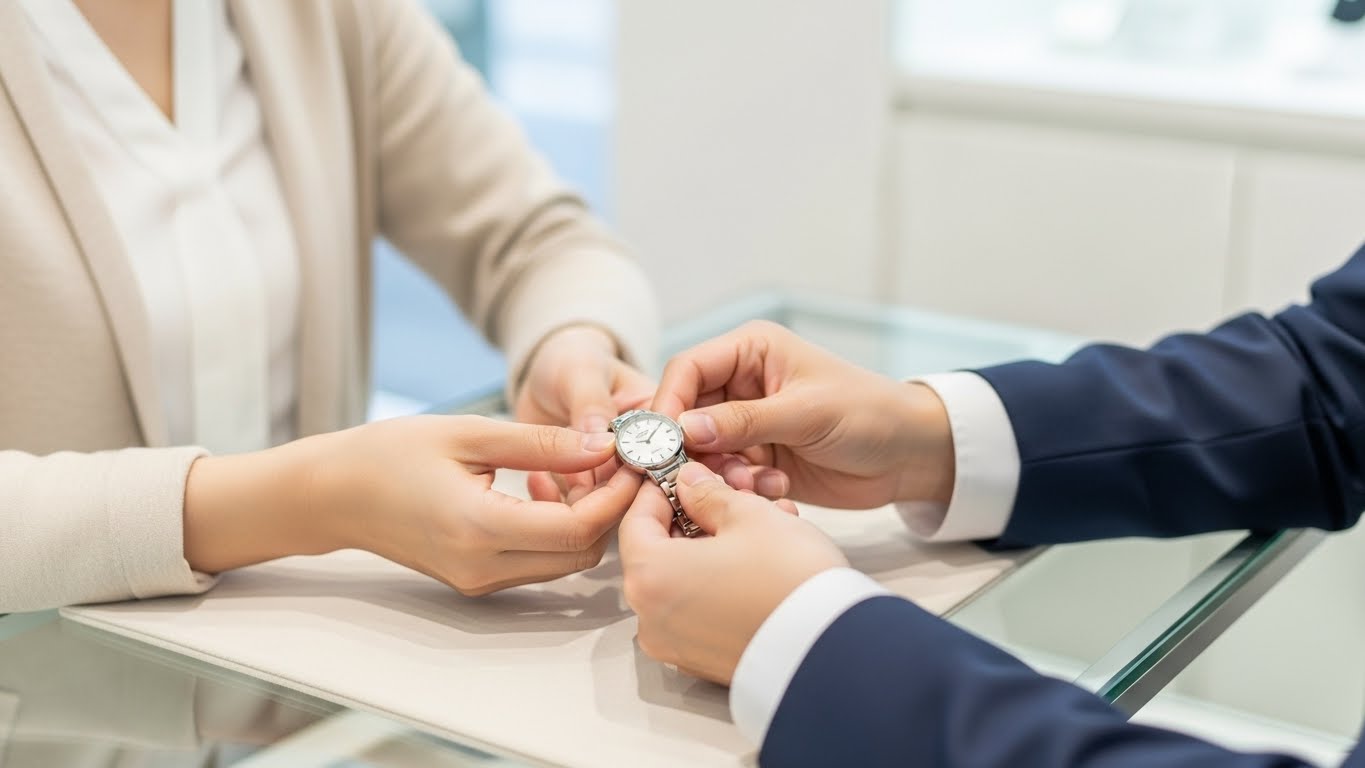 結論として、時計本体と本人確認書類があれば大丈夫です。付属品があれば一緒にお持ちください。査定の流れはスタッフが丁寧にご説明します。