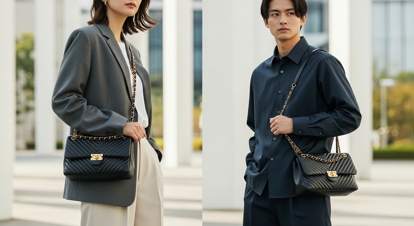 カジュアル系では、白T+デニム+スニーカーに、ブラックのマトラッセチェーンショルダーを短めに斜め掛けするスタイルが人気です。モード系では、オールブラックコーデにシルバー金具のチェーンショルダーを一点投入して、質感で差を付けるスタイリングが選ばれています。ジェンダーレスコーデでは、オーバーサイズシャツとワイドパンツに、ミニサイズのチェーンウォレットを肩掛けするスタイルが増えています。このように、ジェンダーに縛られないスタイリングの中で「シャネルのチェーンショルダー」が”共通言語”として使われている点が、ユニセックス需要拡大の象徴と言えます。