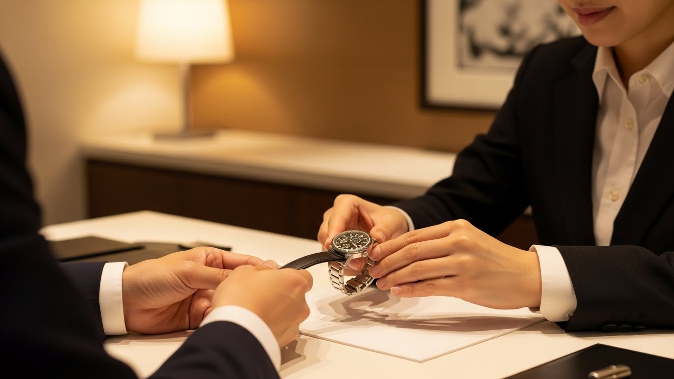 1. 受付 GMTマスターIIと本人確認書類をお預かりし、「海外出張が減った」「コレクション整理をしたい」などのご希望を伺います。
