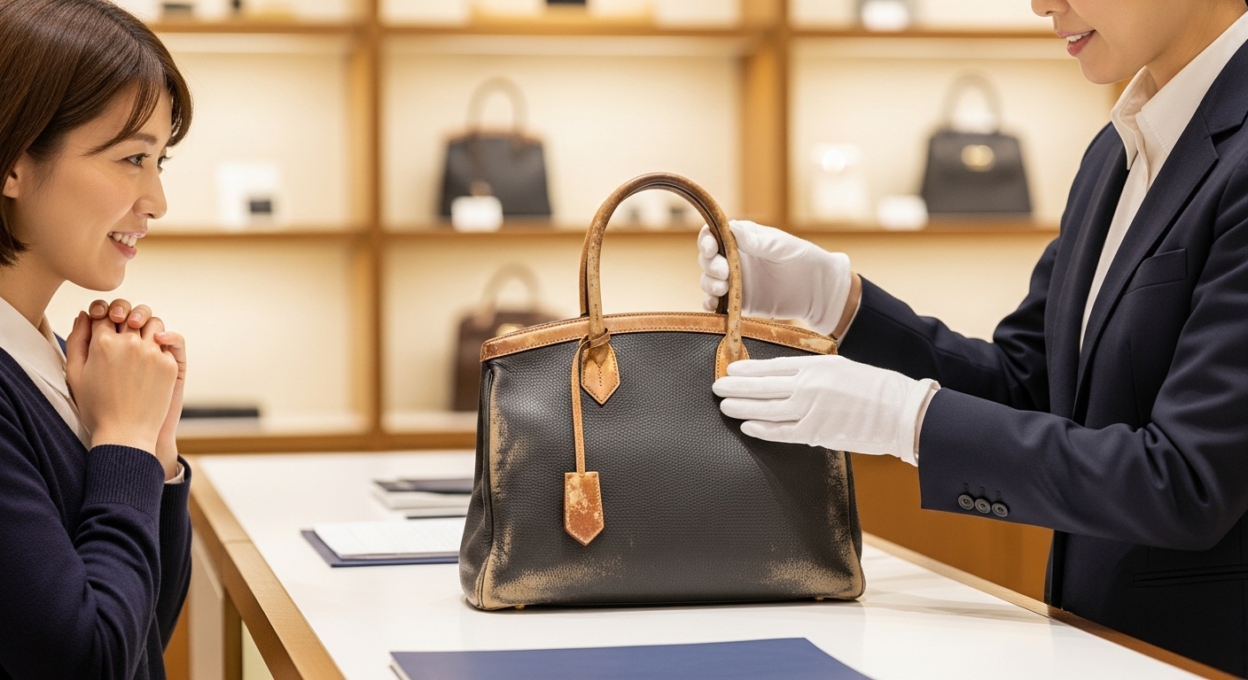 自己流のシミ抜きや補修で状態を悪化させる前に、サイズ・付属品・状態を整理したうえで、経年変化を理解した専門店の「公平査定」を受けることが大切です。